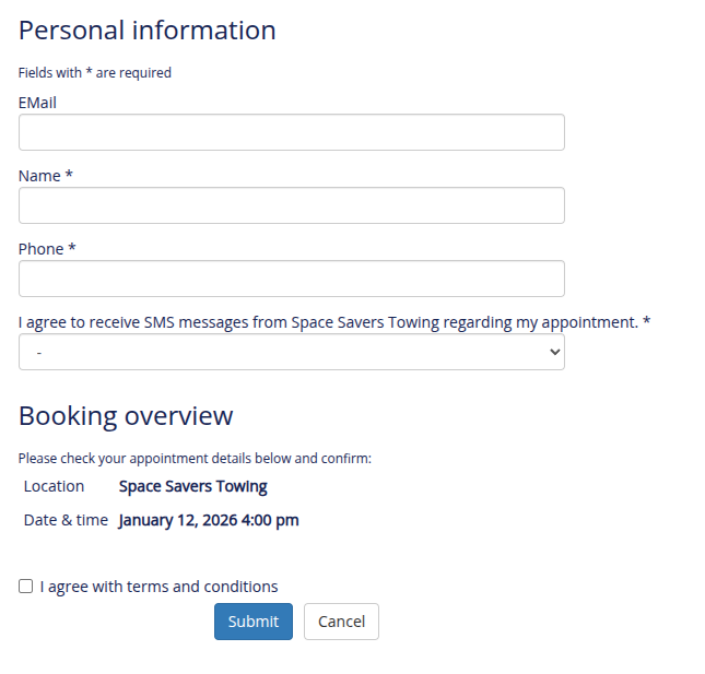 • SMS Messaging: By providing your phone number, you opt-in to receive SMS messages for appointment confirmations, status updates, and other communications from Space Savers Towing regarding your vehicle.